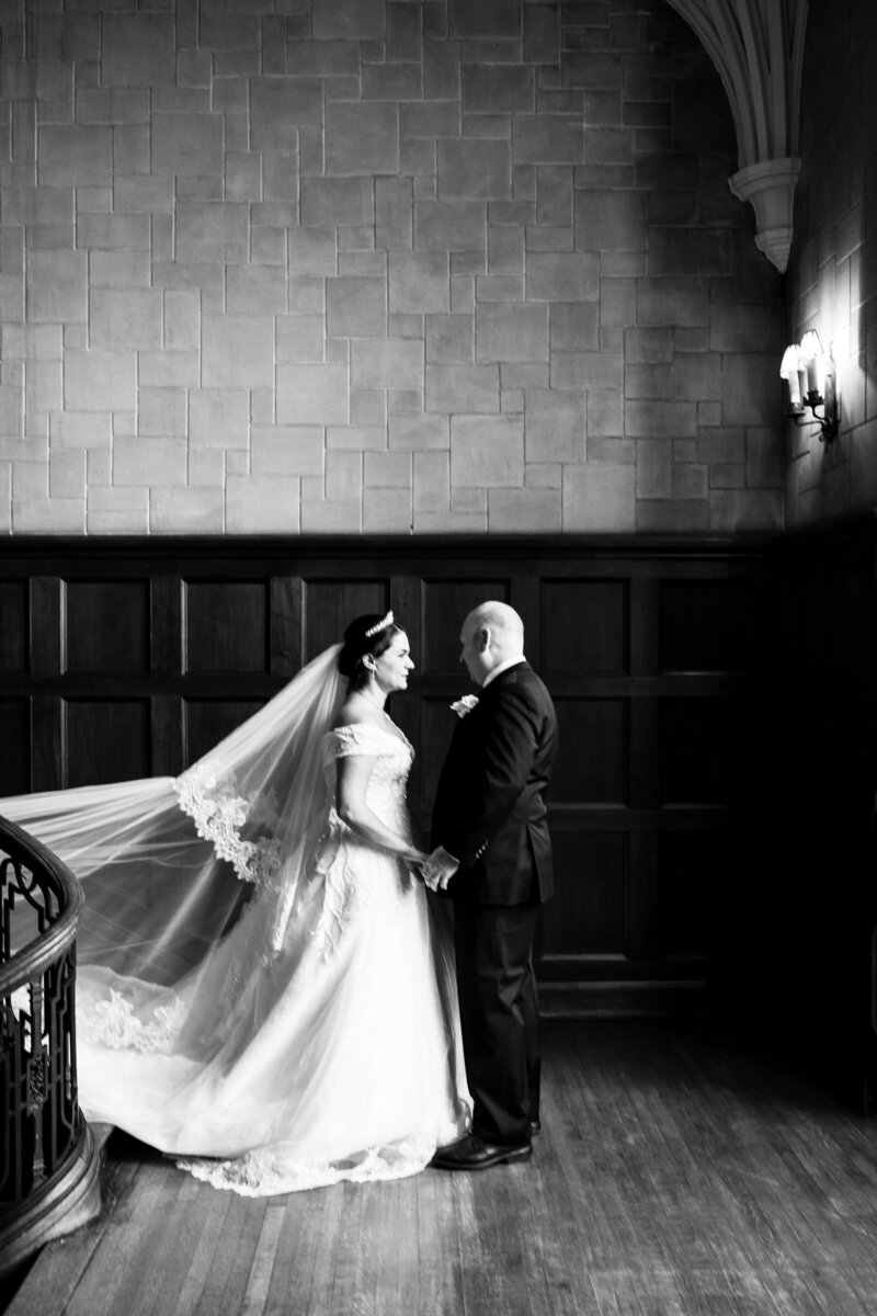 Their first look unfolded like a scene from a storybook. At the top of the sweeping red-carpet staircase, the bride descended with grace, her gown cascading in soft waves as stained-glass light filtered through the windows. At the bottom, the groom stood in anticipation, framed by polished wood and historic grandeur. When their eyes met, time seemed to pause, and every curve, shadow, and glow of Callanwolde became part of their love story—an unforgettable moment set against a backdrop of enduring beauty.
